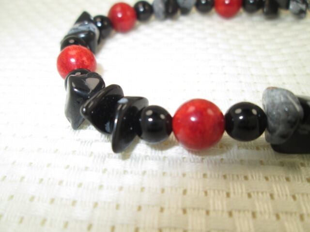 情熱と生命力を象徴するスポンジコーラル、強力な魔除けの石であるオニキス、そして心を落ち着けるスノーフレークオブシディアン。
